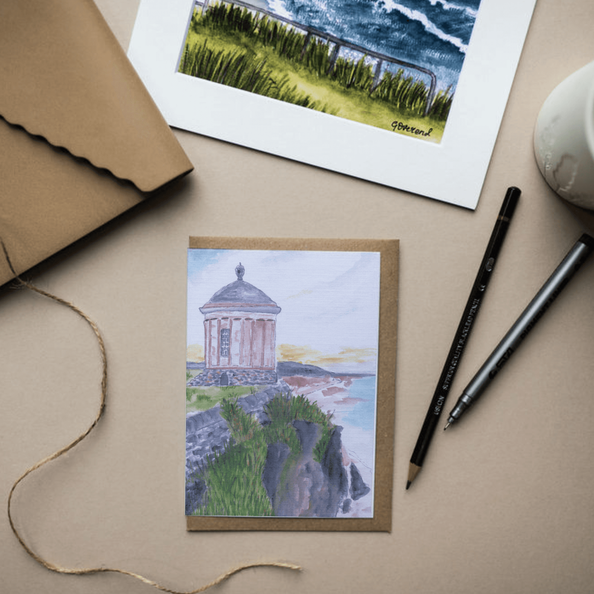 A striking cliffside perspective of Mussenden Temple, reproduced from my original watercolour artwork. Printed on linen 300gsm card for a premium textured finish and supplied with a brown kraft envelope. Blank inside for any occasion.