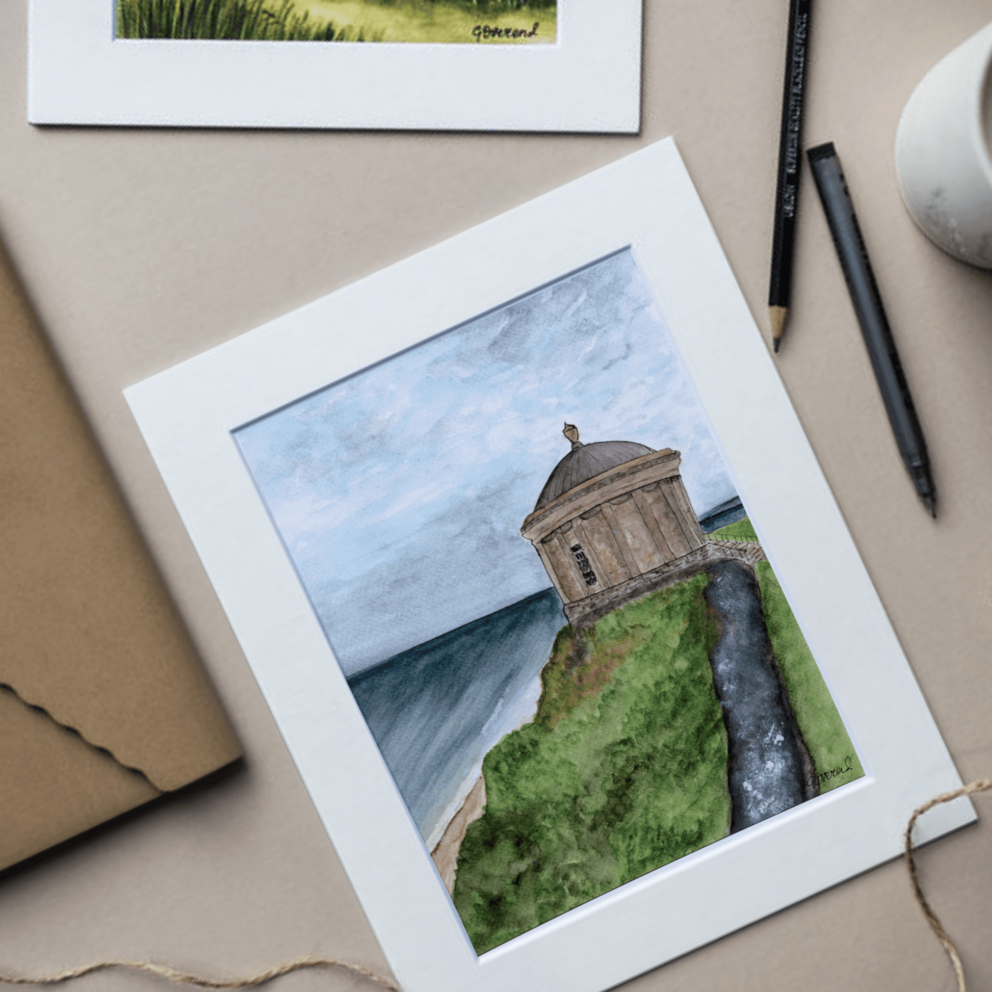 A soft and atmospheric watercolour capturing the iconic Mussenden Temple perched high above the Atlantic Ocean on the North Coast of Northern Ireland. Gentle washes and subtle texture reflect the ever-changing coastal light, creating a calming and nostalgic piece that celebrates one of the region’s most loved landmarks.